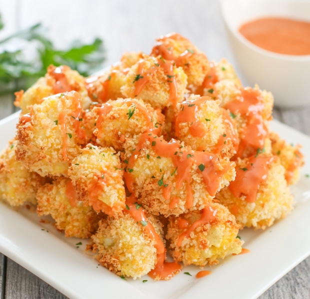 Set the battered cauliflower on the baking sheet in a single layer, it’s best if they don’t touch, and bake for 20-25 minutes until golden and crispy.