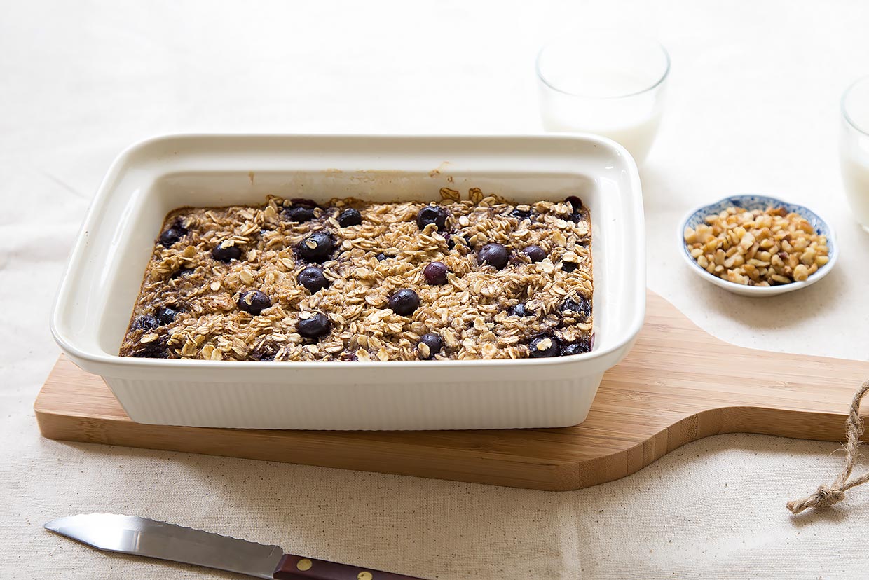 Pour the mixture into the prepared pan. Sprinkle the remaining blueberries and chopped nuts on top of the oats, if using.
