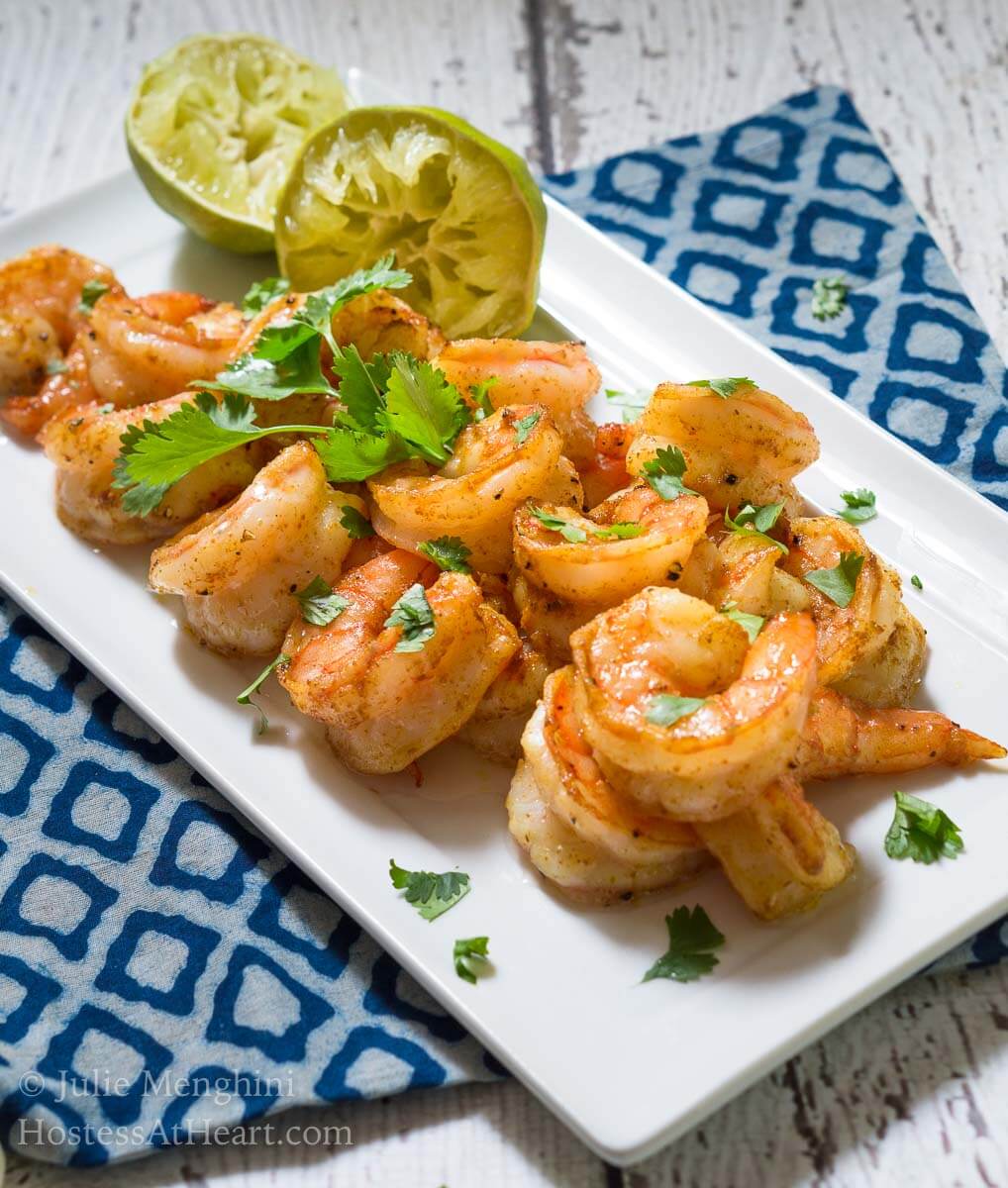 Transfer shrimp to a plate and serve with chopped cilantro (coriander) and extra lime slices.