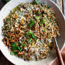 Heat oil in skillet over medium-high heat. Pack an ice cream scoop with farro mixture and turn out onto hot skillet. (Because there are no binders like flour or breadcrumbs, the cakes are almost impossible to form with your hands.) Gently press down farro cakes to slightly flatten them. After a minute or so when cakes are frying nicely, reduce heat to medium. Continue cooking the first side until you can see the bottom turning brown and a thick crust forming, 4 to 5 minutes. Do not flip until a crisp brown crust has formed.
