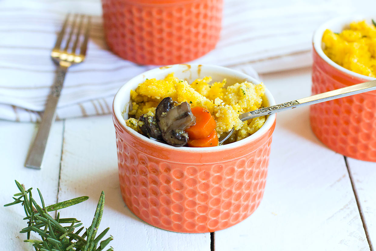 To make the polenta, pour the chicken broth and milk into a medium size saucepan and bring to a boil. Lower the heat to medium and slowly whisk in the polenta. Cook, stirring frequently, until the polenta is soft and beginning to thicken, about 10 to 15 minutes. Stir in 4 ounces cheddar cheese and butter if using, season with salt and pepper. If the polenta seems a little thick you can add a tablespoon of butter or extra milk. Spoon the polenta over the pot pie filling and then top each pie with the remaining cheddar cheese.