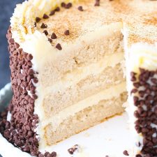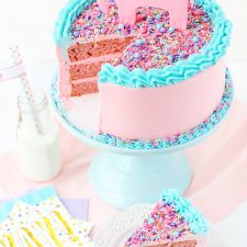First, using a large serrated knife, slice a thin layer off the tops of the cakes to create a flat surface. Discard (or crumble over ice cream!). Place 1 cake layer on your cake stand or serving plate. Evenly cover the top with frosting. Top with 2nd layer and spread the remaining frosting all over the top and sides. Decorate top of cake with sprinkles, if desired. Slice, serve, enjoy!