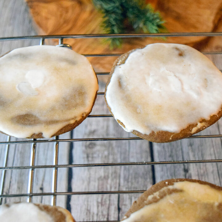 When the cookies are almost completely cooled, dip the top of each cookie in the icing and spread with the back of a knife. You can also use a pastry brush and brush it on. Place the glazed cookie back on the wire rack to dry.