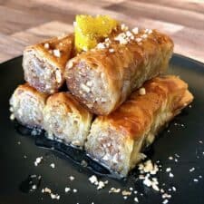 Using a sharp knife cut into diamond or square shapes all the way to the bottom of the pan. You may cut into 4 long rows the make diagonal cuts. Bake for about 50 minutes until baklava is golden and crisp.