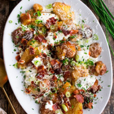 Bake the smashed potatoes in the preheated 425ºF oven for about 30 minutes, or until the edges are golden brown and crispy.