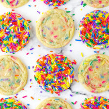 Place a couple pinches of sprinkles on top of each cookie and press down into the tops of the cookie.