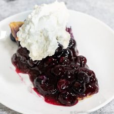 If you prefer to make a lattice crust on top, roll the second dough round into a 12 inch square-ish shape and cut that into 8 equal strips for the lattice crust top. Place the pastry strips on top of the blueberry mixture, interweaving them to form a simple lattice pattern. Tuck the ends of the strips under the edge of the bottom crust and crimp with a fork or your fingers to seal the pastry together. Brush the edges of the crust and the lattice top with an egg wash.