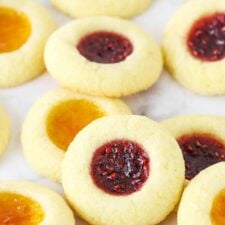 Use a medium cookie scoop (1 tablespoon size), to portion out the dough, then use your hands and roll each one into a ball. Place the cookie on the baking sheet and press into the cookie to make a well using either your thumb or a round kitchen tool.